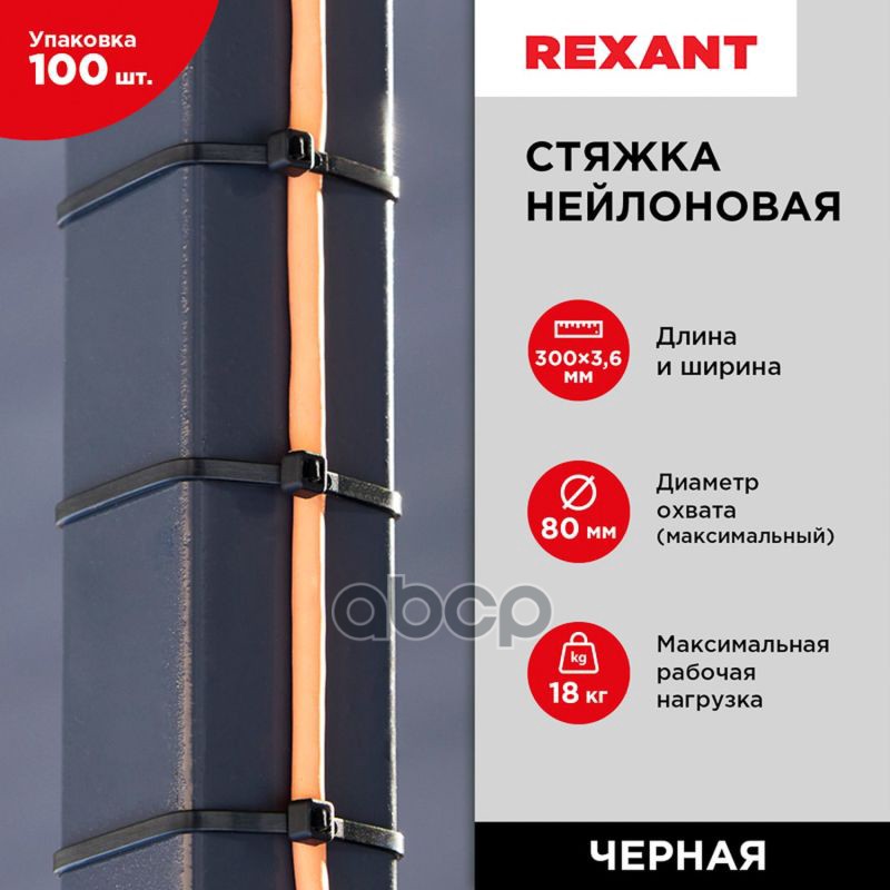 Наименование: Хомуты-стяжки 300х3.6 мм REXANT кабельные нейлон (пластик) Черные min100 REXANT