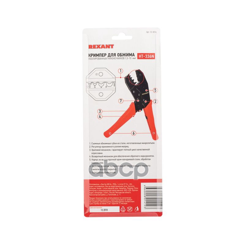 Бренд: REXANT, артикул: 123016, кримпер HT-336 N для обжима изолированных и неизолированных гильз 1.5-10.0мм2. |