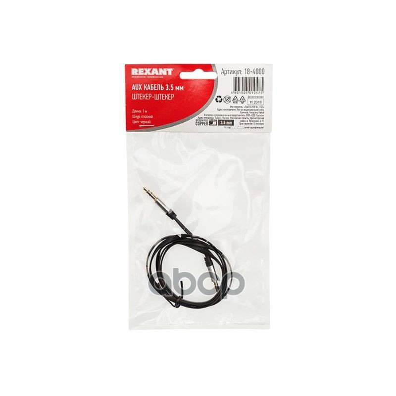 Бренд: REXANT, артикул: 18-4000, Кабель AUX 3,5 мм 1 м черный плоский Rexant. |