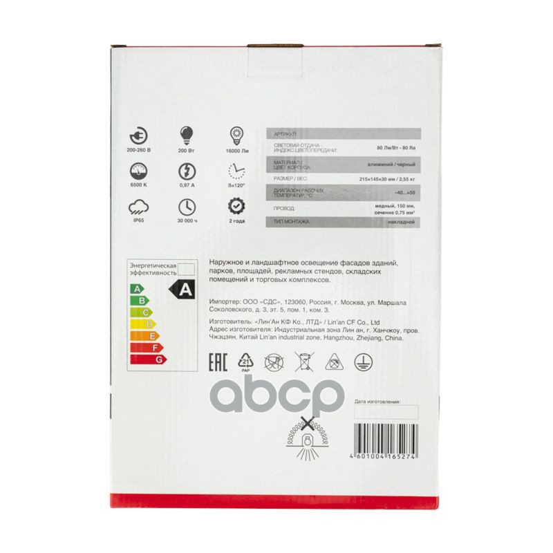 Наименование: REXANT Прожектор светодиодный 200 Вт 200 260В IP65 16000 лм 6500 K холодный свет