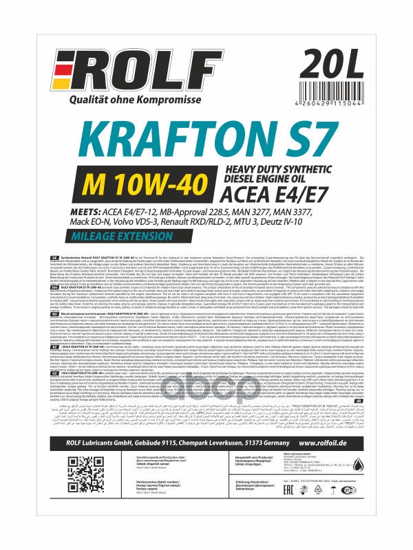 Наименование: Масло Rolf Krafton S7 M 10/40 ACEA E4/E7 синтетическое 20л 322461 10W40; 102849