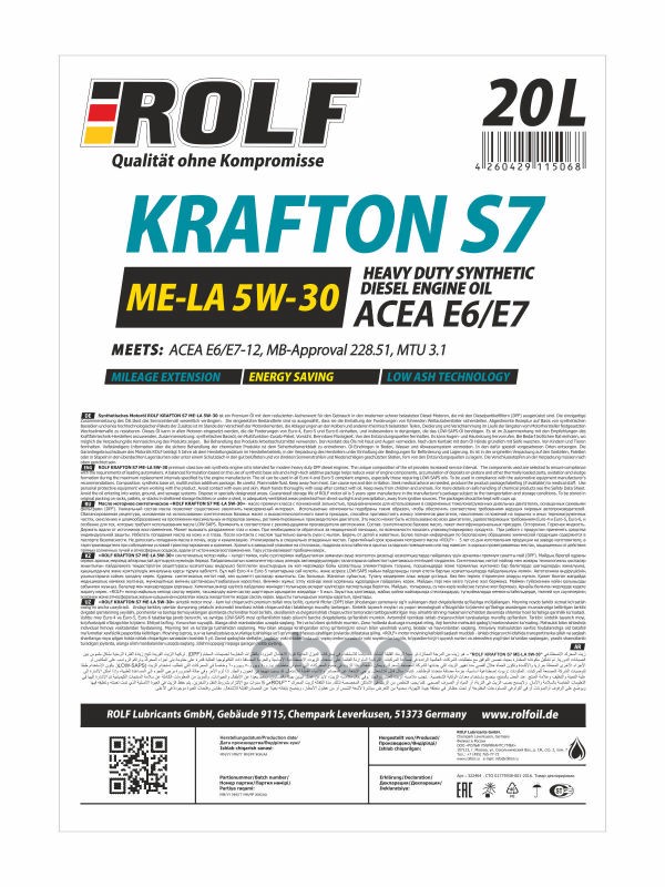 Наименование: Масло моторное ROLF KRAFTON S7 ME-LA 5W30 20л