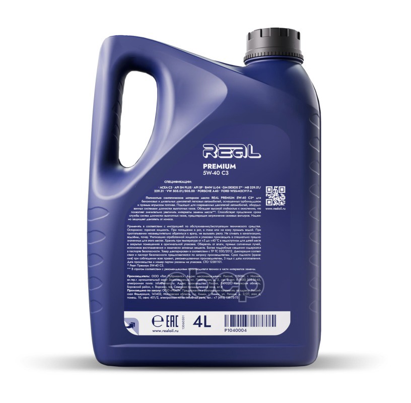 Купить запчасть P1040004 Масло моторное REAL PREMIUM 5W40 C3 4Л ACEA C3, API SN PLUS, API SP BMW LL-04, GM Dexos 2™, MB 229.31, 229.51, VW 505.01, VW 505.00, Porsche A40, FORD - WSS-M2C917-A, Синтетика с доставкой в Эль-Монте.