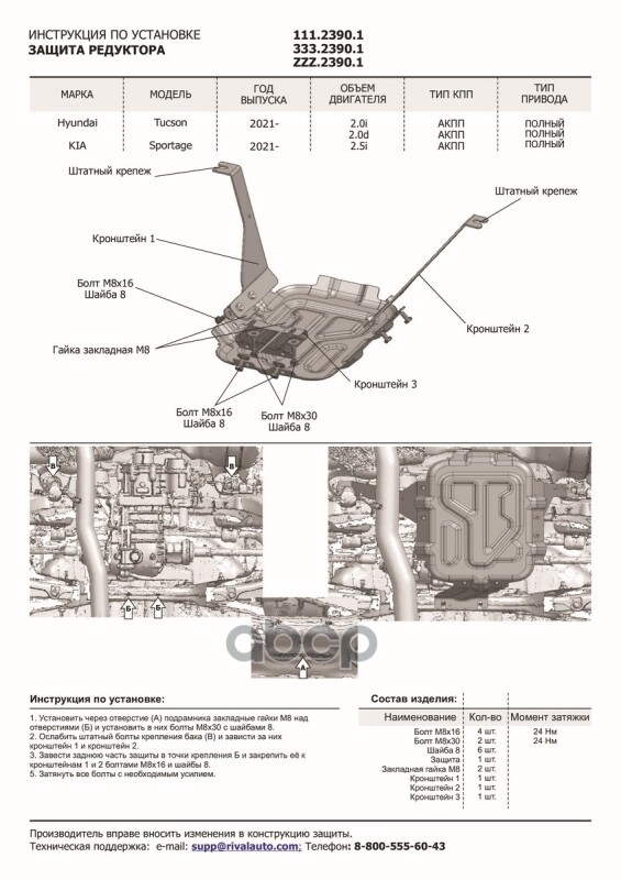 Наименование: Защита редуктора + комплект крепежа, RIVAL Сталь,Kia Sportage 2021-, V - 2.5, Hyundai Tuc