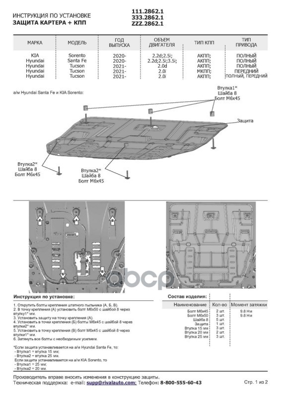 Наименование: Защита картера + КПП HYUNDAI Santa Fe/Tucson, KIA Sorento 2.0-3.5/2.2D 20->