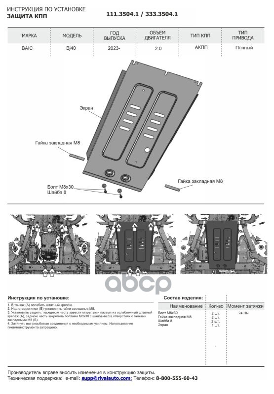 Наименование: Защита КПП (алюминий 3 мм) + комплект крепежа для BAIC BJ40 2023- (V - 2.0, АКПП