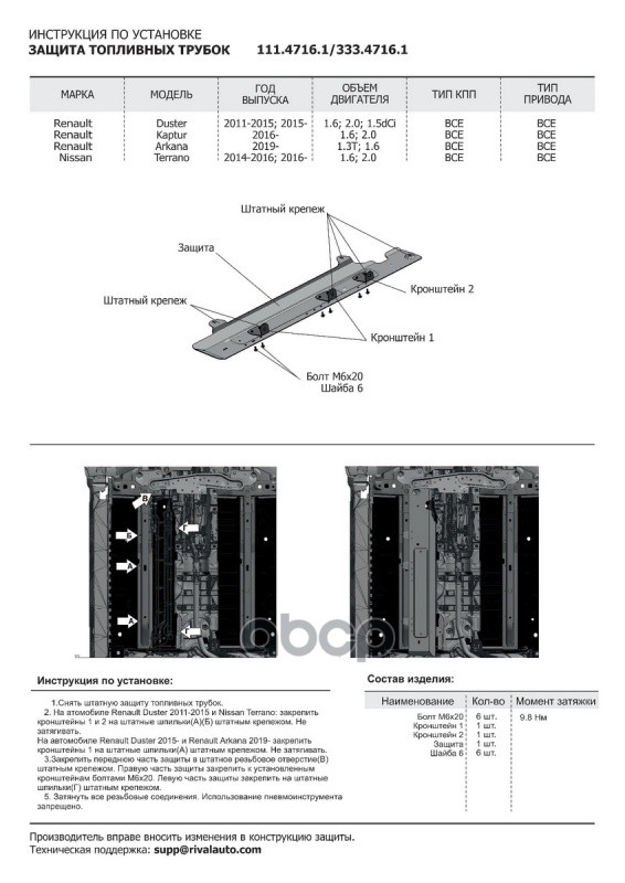 Наименование: Защита топливных трубок (алюминий 4 мм) + комплект крепежа для Renault Duster 20