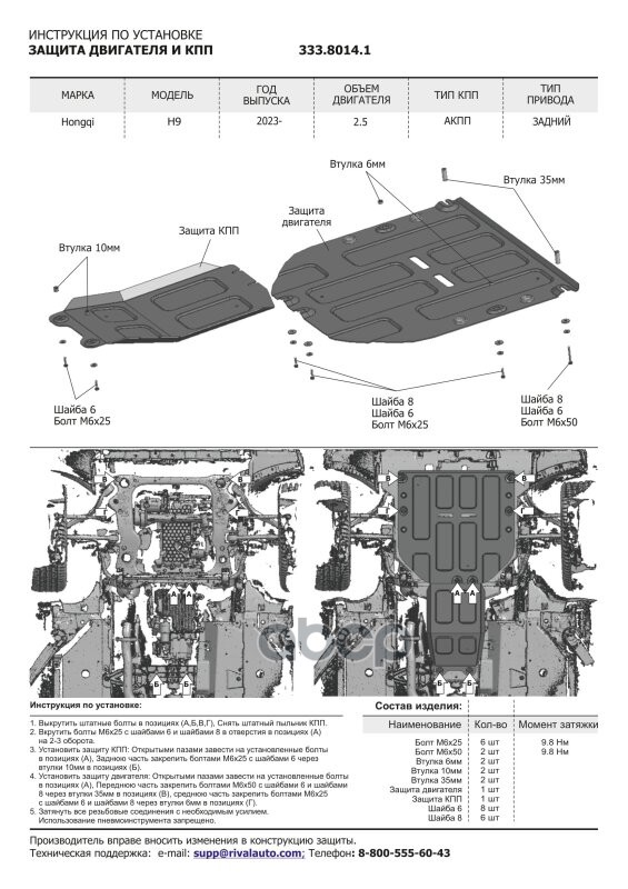 Наименование: Защита картера + КПП (алюминий 3 мм) + комплект крепежа для Hongqi H9 2023- (V -