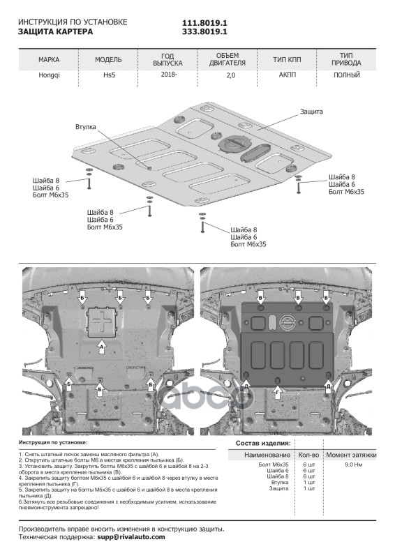 Купить запчасть 33380191 Защита картера + комплект крепежа RIVAL, Алюминий, Hongqi HS5, V-2.0, АКПП, 2018-, бензин с доставкой в Эль-Монте.