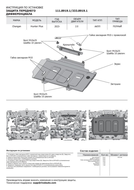 Купить запчасть 33389191 Защита переднего диффернициала + комплект крепежа, Rival, Алюминий, CHANGAN HUNT с доставкой в Эль-Монте.