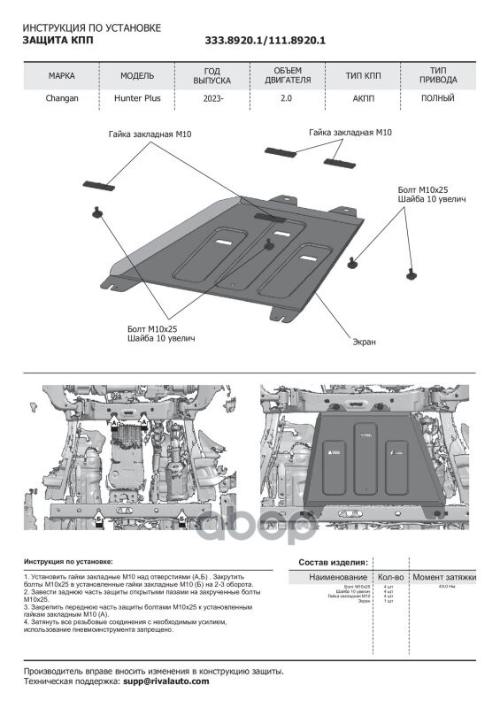 Наименование: Защита КПП+ комплект крепежа, Rival, Алюминий, CHANGAN HUNTER PLUS, V-2.0, АКПП,