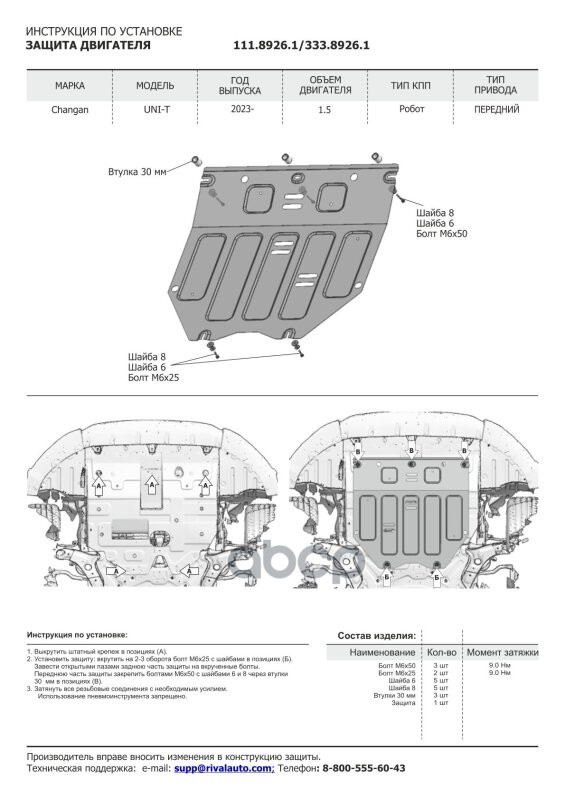 Наименование: Защита картера (алюминий 3 мм) + комплект крепежа для Changan UNI-T 2023- (V - 1