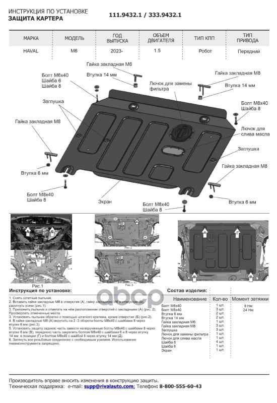 Наименование: Защита картера+ крепеж, Rival, Алюминий, Haval M6, V-1.5, Робот 2023-