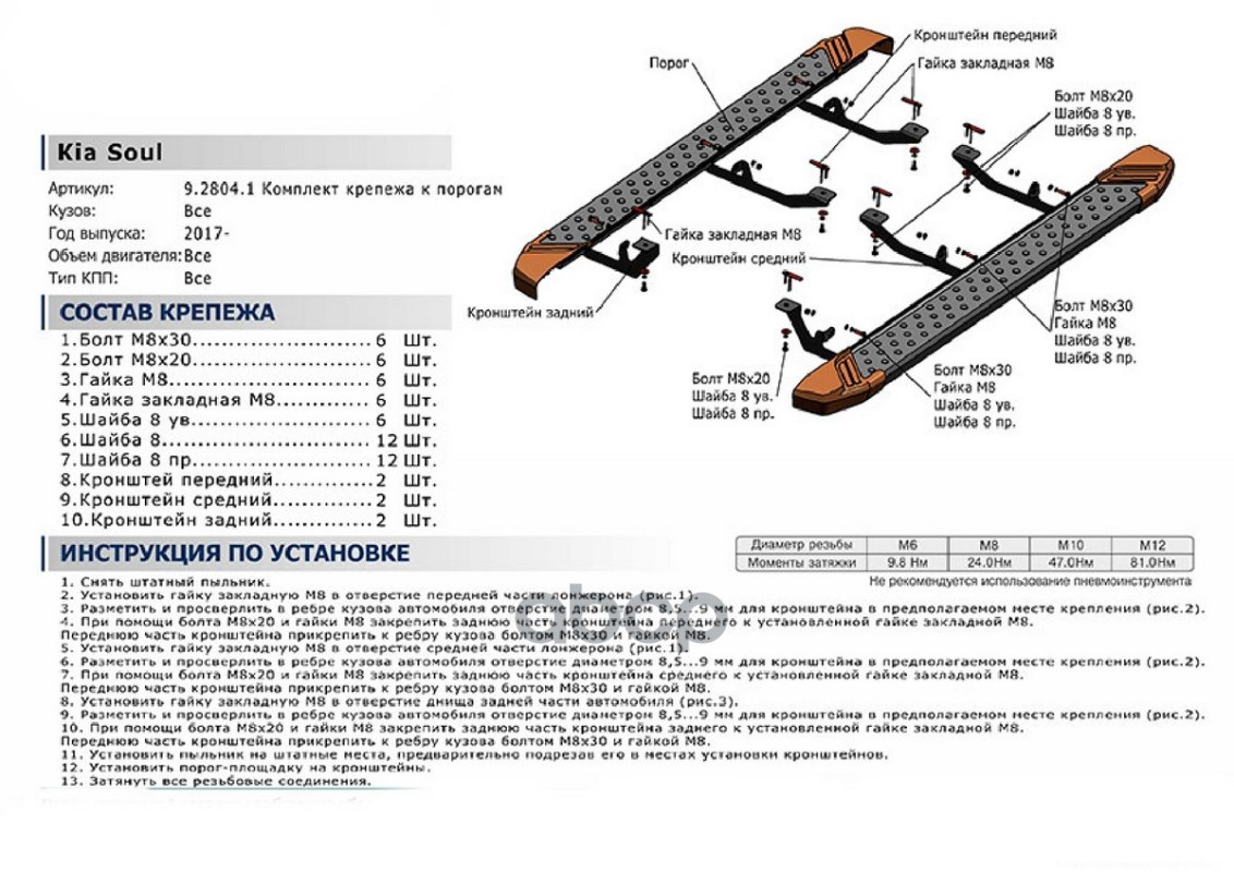 Комплект крепежа к порогам Kia Soul 2017-2019