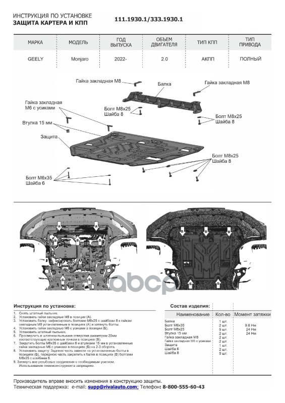 Наименование: Защита картера + КПП + топливных магистралей+ редуктора+ комплект крепежа, Rival