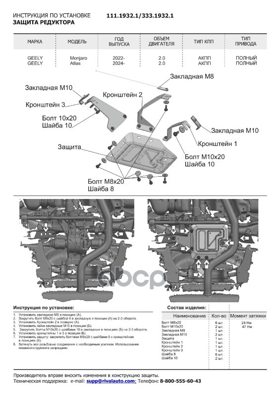 Защита картера + КПП + топливных магистралей+ редуктора+ комплект крепежа, Rival