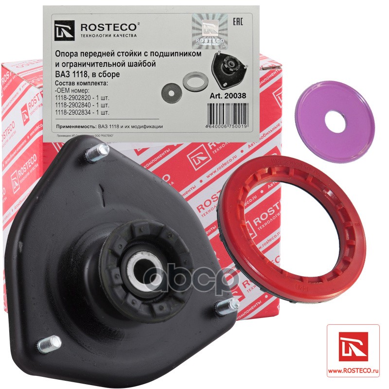 Бренд: Rosteco, артикул: 20038, Опора передней стойки (люстра) ВАЗ 1118 с подшипником и ограничительной шайбой Rosteco 1118-2902820, 1118-2902840, 1118-2902834. |