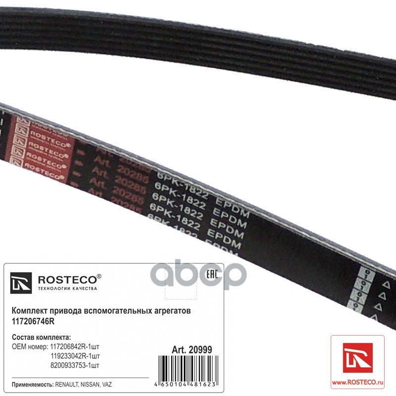 Бренд: Rosteco, артикул: 20999, Комплект приводного ремня Renault Logan ph2, Sandero 16 клапанов ремень, 2 ролика 20999 117206746R. |