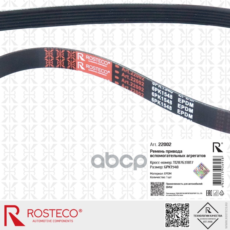 Бренд: Rosteco, артикул: 22002, Ремень приводной BMW, (6PK1548) EPDM. 11287631817 "ROSTECO". |