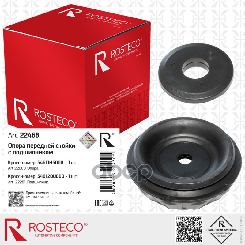 Бренд: Rosteco, артикул: 22468, Опора амортизатора Hyundai Solaris 17-; Kia Rio 17- переднего с подшип. Rosteco 22468 54611H5000;546120U000;AMDSB1661;ADBP800075;171983;12K1152;54611H5000;MS13021;. |