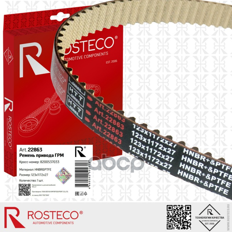 Купить запчасть 22863 Ремень ГРМ RENAULT, (123x1172x27) HNBR+PTFE. 8200537033 "ROSTECO" с доставкой по России.