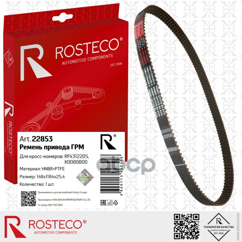 Ремень ГРМ CHANGAN, MAZDA, RENAULT, (148x1184x25,4) HNBR+PTFE. RF4312205, K0080800 "ROSTECO"