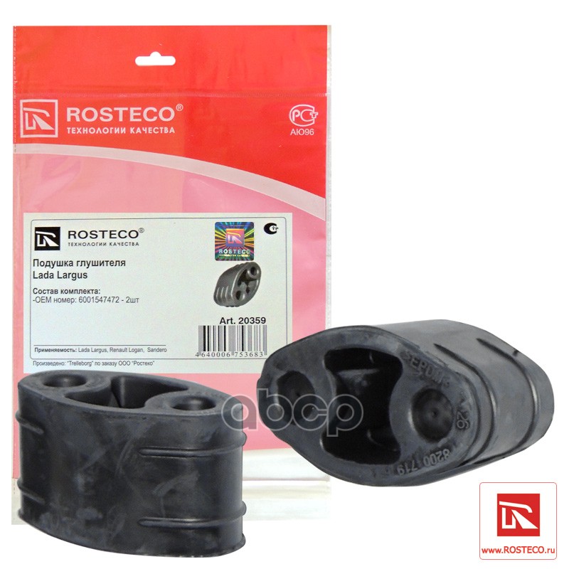 Подушка крепления глушителя Lada Largus; Renault Logan, Sandero 2 шт. Rosteco 6001547472 20359 4640006753683;6001547472;8200205244;206514AA0B;