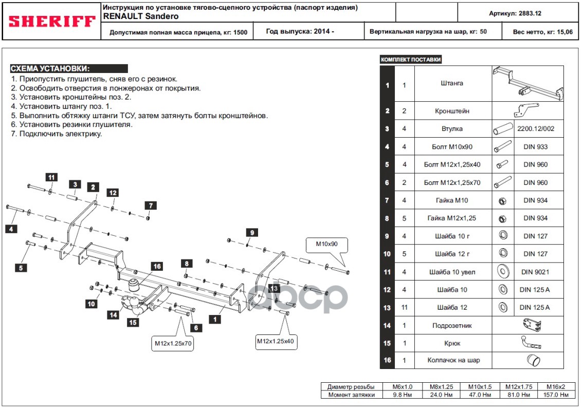 Наименование: Фаркоп Renault Sandero 2014-2022 съемное крепление шара на двух болтах