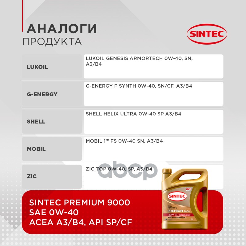 Наименование: Масло моторное синтетика 4л Sintec Premium 9000 0W-40 A3/B4 SP/CF 4л