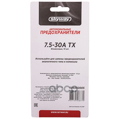 Купить запчасть S09302005 Предохранитель флажковый набор 7,5 -30 А блистер 10 шт. Skyway 00000199581 с доставкой в Эль-Монте.
