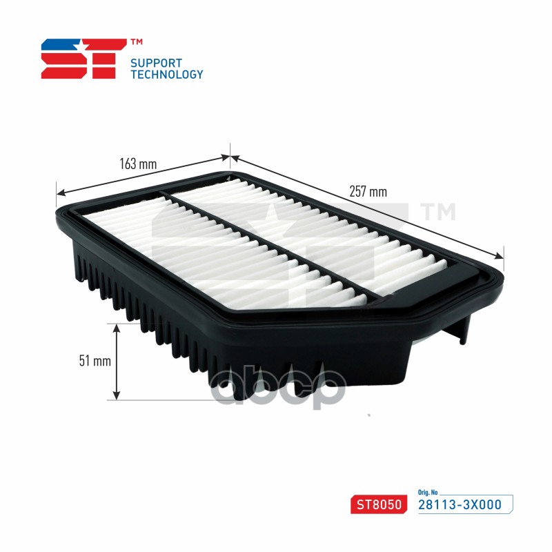 Бренд: Support Technology, артикул: ST8050, Фильтр воздушный Hyundai Elantra (MD) 11-, I30 (GD) 10-; Kia Ceed (JD) 12-, Cerato (YD) 13- ST 28113-3X000 19372632;HA728;AMDFA68;GB963;ADG022100;ADG022115;0986AF2422;F026400481;AP1229;CA10889;AG358;LF0199;281133X000;FAH23S;A9326;JDAX070;LX3537;LA2079;EAF. |