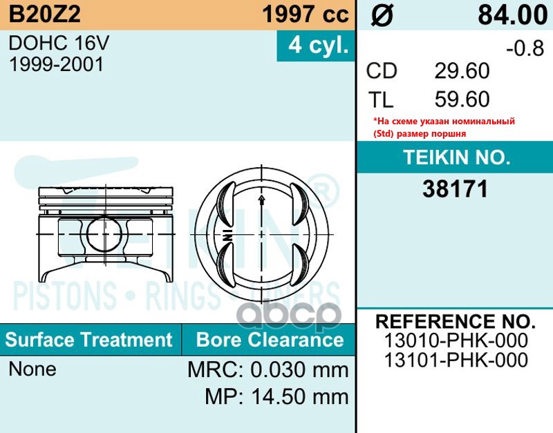 Наименование: Поршни (к-т 4шт) 0,50 B20B CR-V '99- 84/1,2/1,2/2,8 d=21