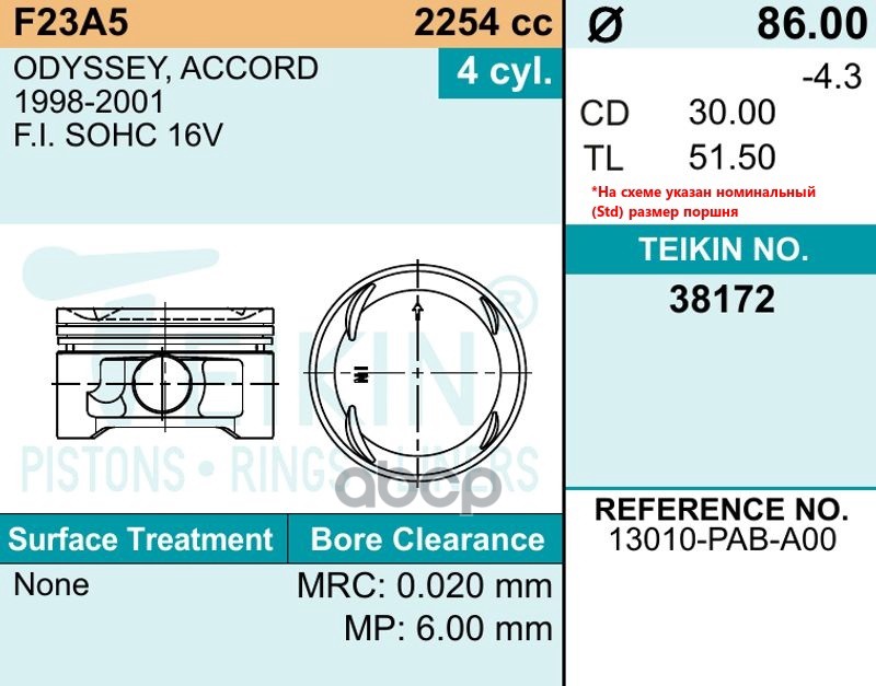 Купить запчасть 38172050 Поршень без колец Honda F23A5 d86.0+0.5 (13010-PAB-A00) Teikin с доставкой в Эль-Монте.