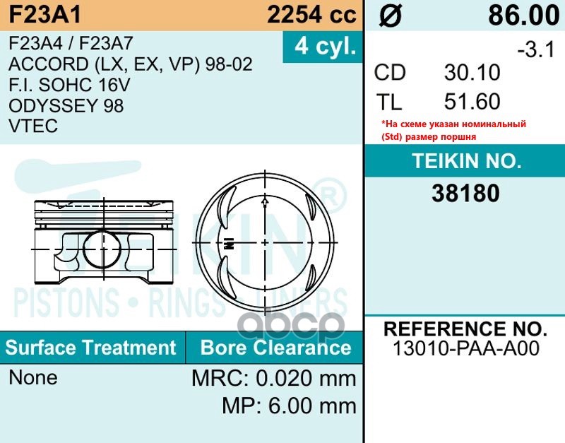 Наименование: 38180050 Поршень с пальцем к-т (0,5) Honda F23A1