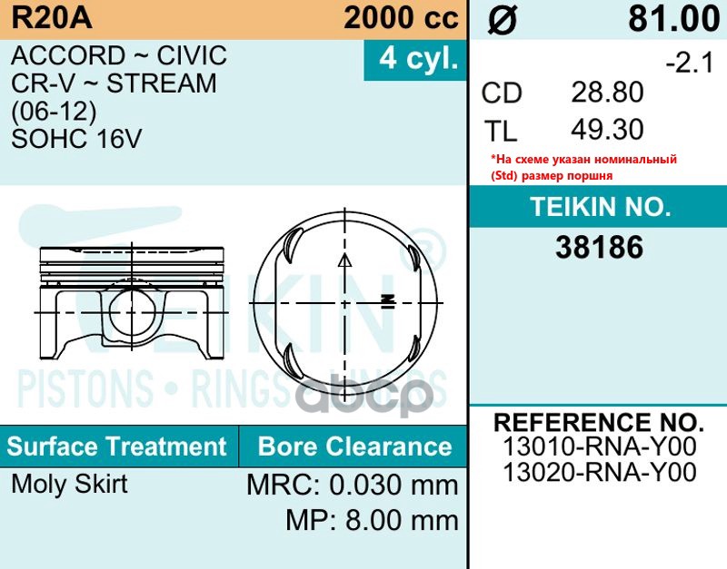 Наименование: Поршни (к-т 4шт) 0,50 R20A CR-V '07- 81/1,2/1,2/2 d=19,9