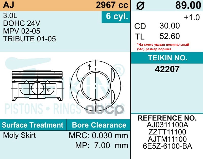 Наименование: Поршни (к-т 6шт) STD AJ 3.0L '02-'05 89/1,2/1,5/2,5 d=21