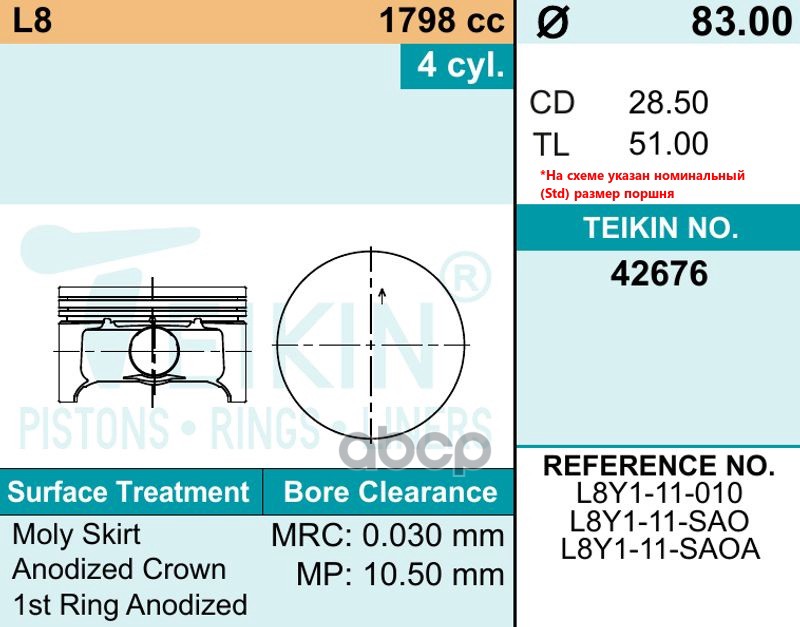 Наименование: Поршень без колец Mazda L8 d 83.00 +0,50 1.2x1.2x2 (7 00