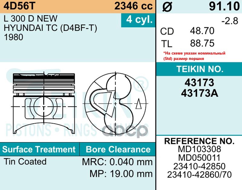 Купить запчасть 43173STD Поршень без колец Mitsubishi 4D56T d91.1 STD Teikin с доставкой в Эль-Монте.