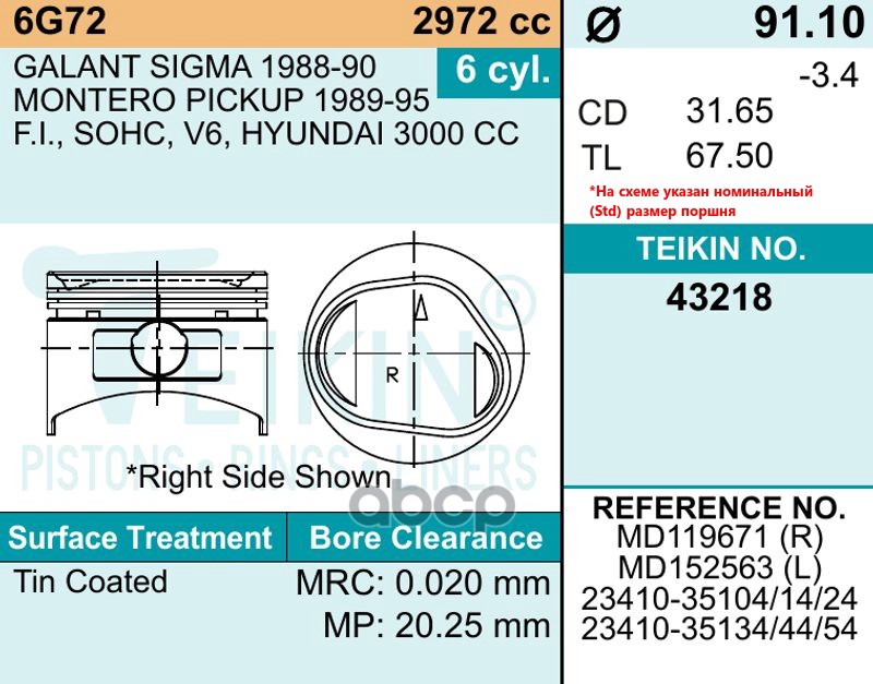 Наименование: Поршень без колец Mitsubishi 6G72 d91.1+0.50 Teikin