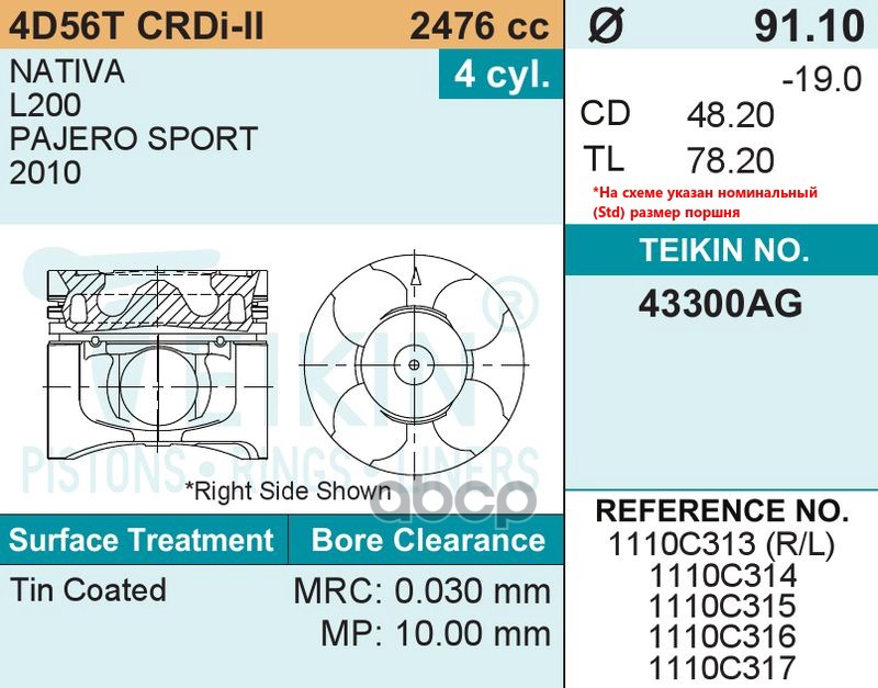 Бренд: TEIKIN, артикул: 43300AG050, КОМПЛЕКТ ПОРШНЕЙ 4D56 CRDI-II. |