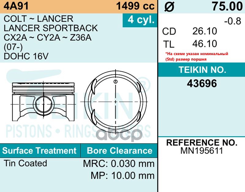 Купить запчасть 43696STD Поршни (к-т 4 шт) MITSUBISHI LANCER X/COLT 4A91 07- с доставкой в Эль-Монте.