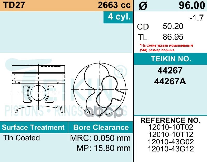 Наименование: TEIKIN Поршень двигателя с пальцем 1шт 44267-STD