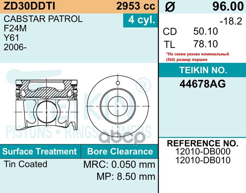 Бренд: TEIKIN, артикул: 44678AG050, TEIKIN ПОРШЕНЬ КОМПЛЕКТ 44678-AG-050 12010-DB000. |