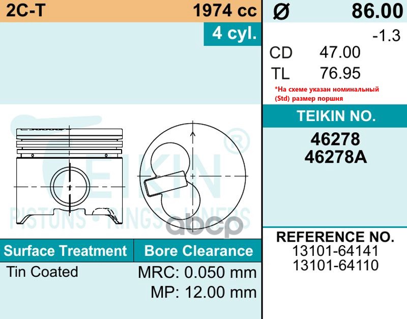 Купить запчасть 46278050 Поршень без колец Toyota 2C-T d86.0+0.50 Teikin с доставкой в Эль-Монте.