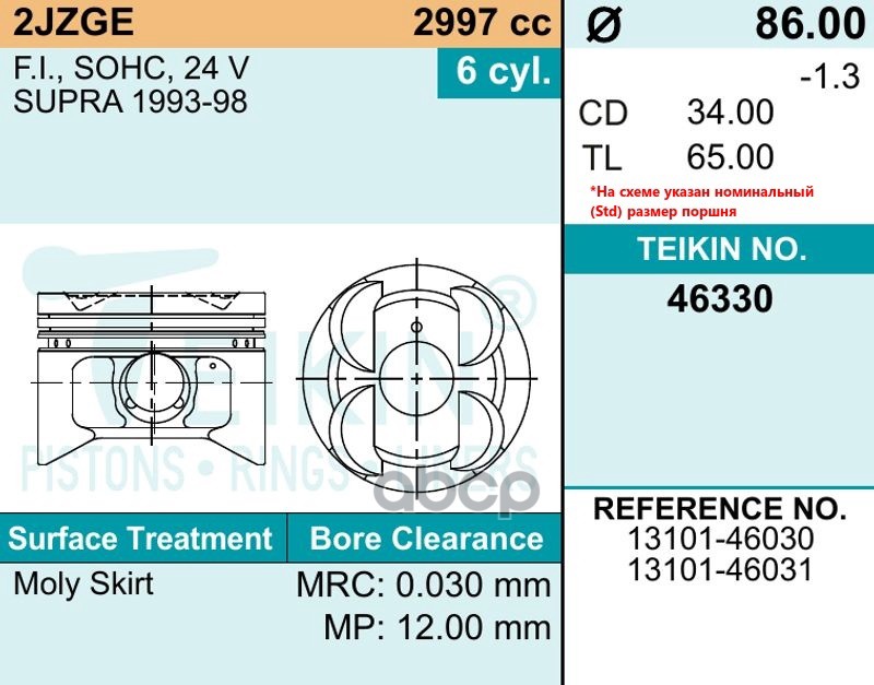 Купить запчасть 46330050 Поршень без колец Toyota 2JZ-GE -98 d86.0+0.50 (13101-46031) Teikin с доставкой в Эль-Монте.