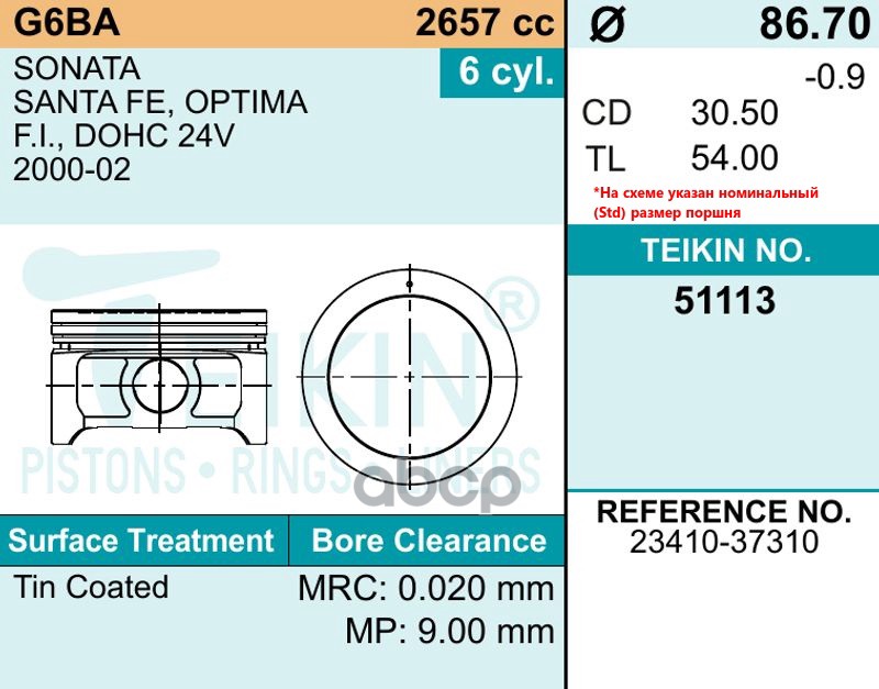 Купить запчасть 51113050 Поршень без колец Hyundai G6BA DOHC 24V d86.7+0.50 (23410-37936) Teikin с доставкой в Эль-Монте.