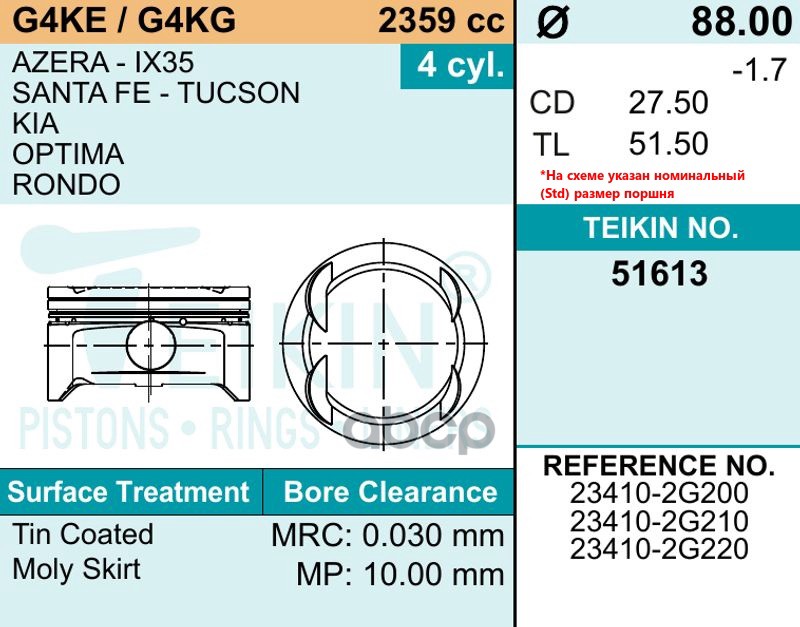 Купить запчасть 51613050 к-кт поршней 0.50 (4 шт.) Hyundai Sonata, KIA Optima 2.4 DOHC 82> с доставкой в Эль-Монте.