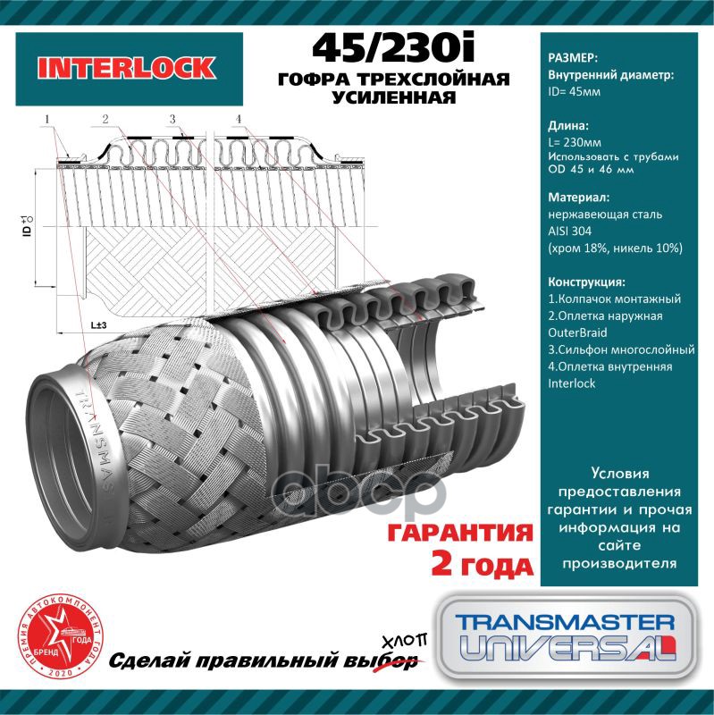 Бренд: TRANSMASTER, артикул: 45230I, ГОФРА 45 0.5Х230 2 ТРЕХСЛОЙНАЯ INTERLOCK 77634. |