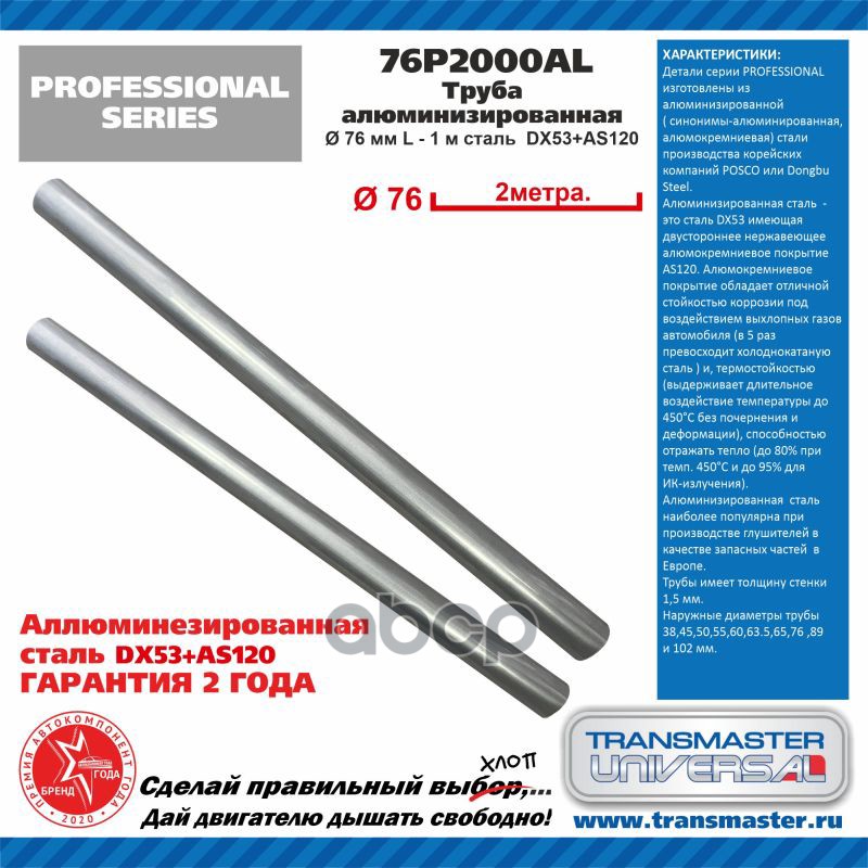 TRANSMASTER UNIVERSAL 76P2000AL Бренд: TRANSMASTER, артикул: 76P2000AL, Труба алюминизированная L - 2 м, O 76 мм сталь.