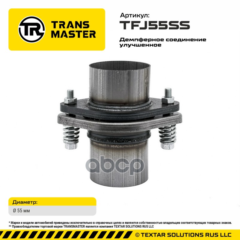 Бренд: TRANSMASTER UNIVERSAL, артикул: TFJ55SS, Демпферное соединение глушителя d=55 улучшенное TRANSMASTER UNIVERSAL TFJ55SS. |